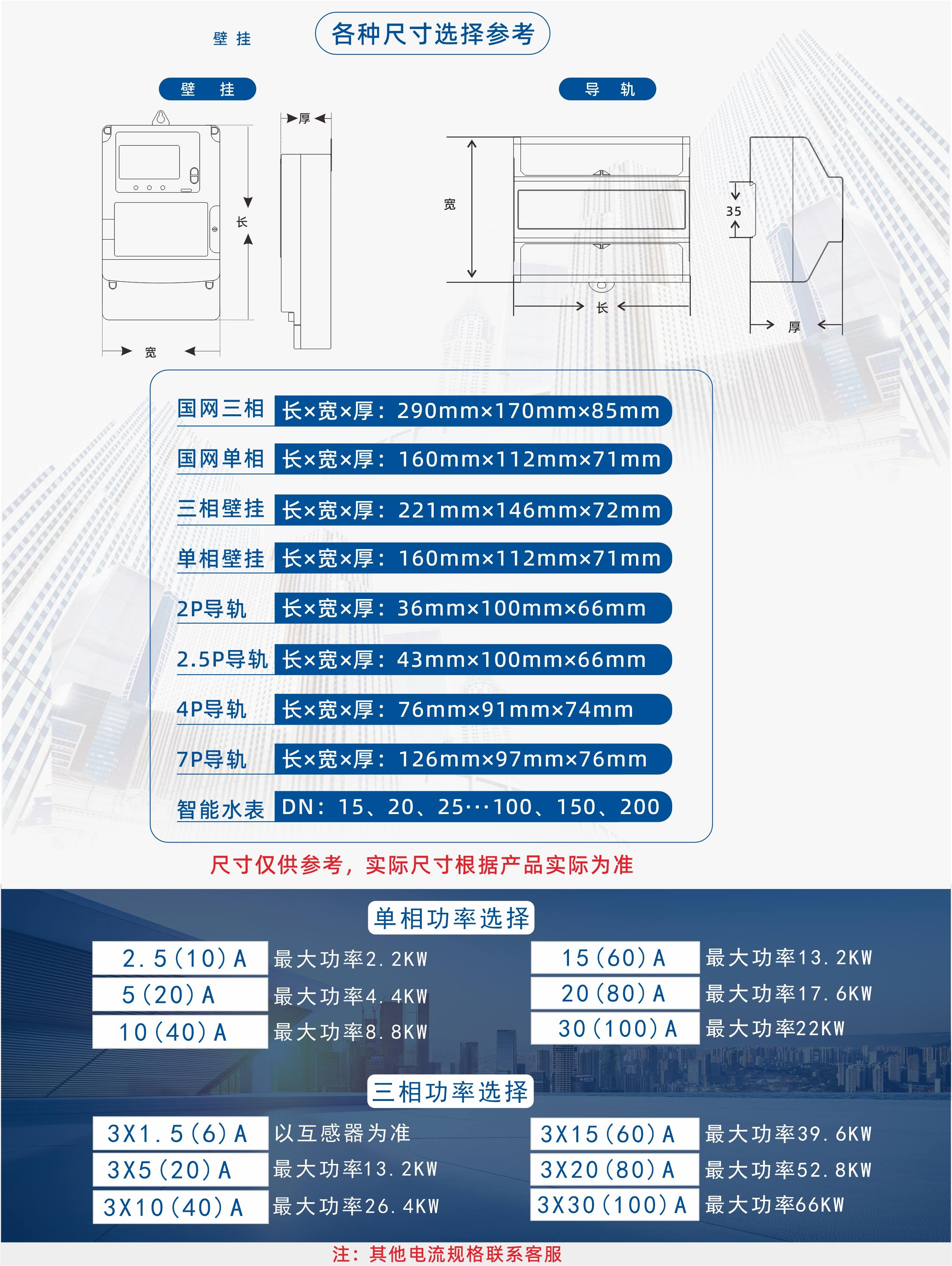 本公司集多年电表设计经验,推出新型智能电表,可选RS485、NB-LOT(5G)、4G、WIFI、蓝牙、ROLA、载波等方式通讯。该系列仪表具有体积小、精度高、可靠性好、安装方便等优点,性能指标符合国标GB/T17215、GB/17883的各项技术要求。