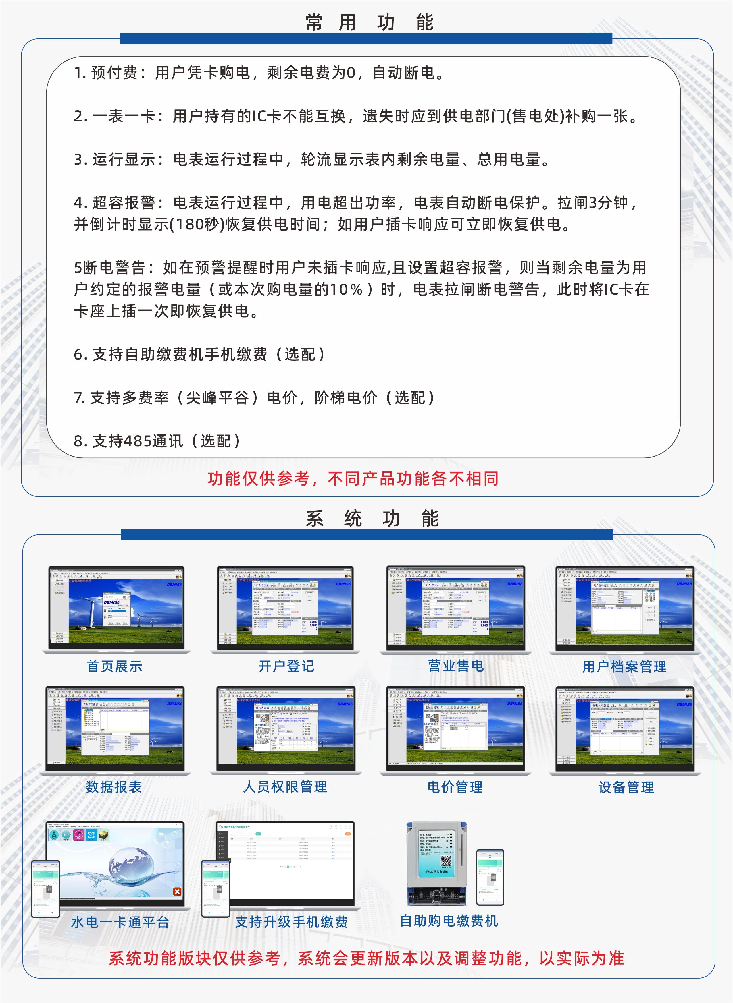 预付费电表可实现先缴费后用电,电费为零自动断电等特点,支持一卡一表或一卡多表(农业灌溉)符合各种场景使用,彻底解决传统收费问题,方便管理