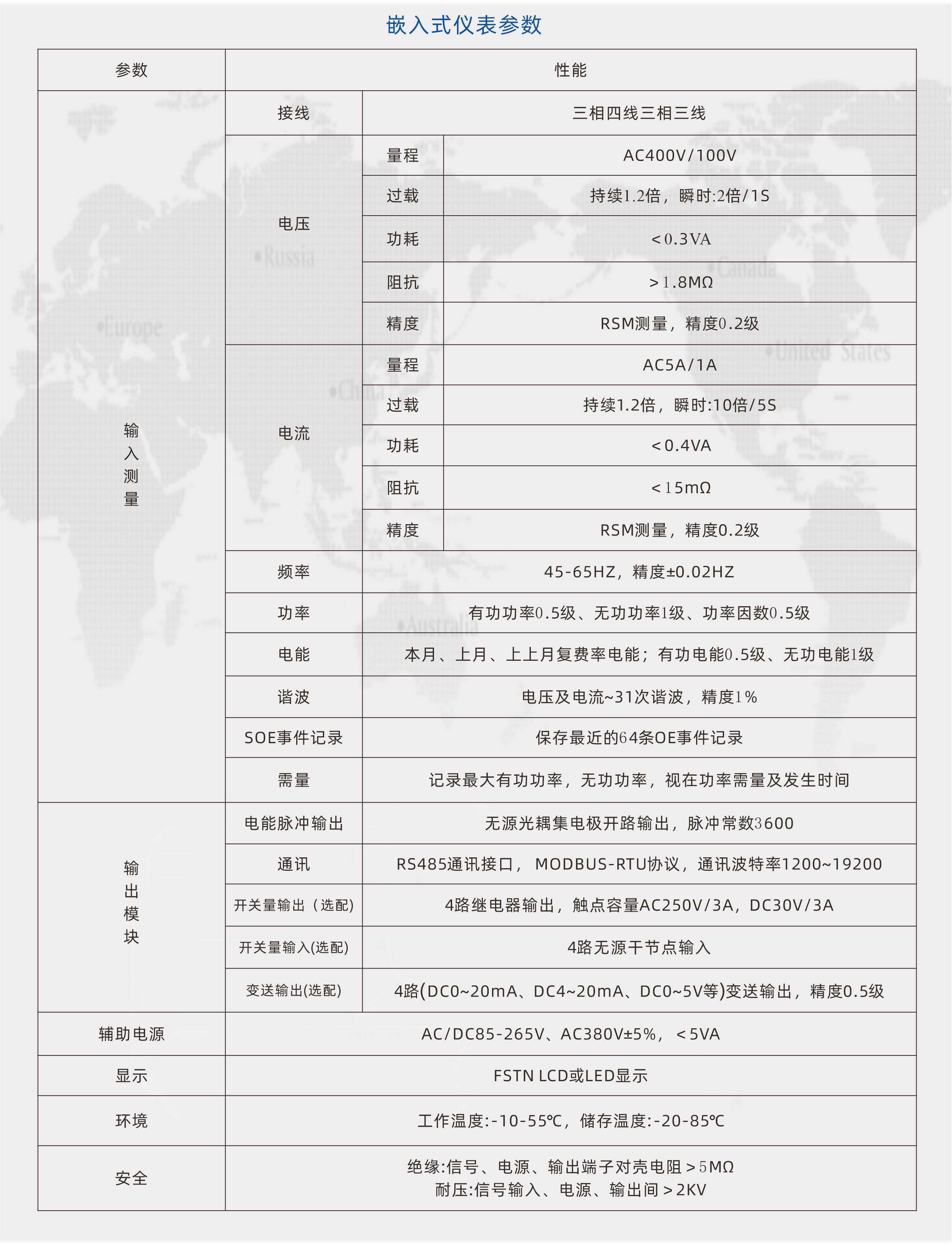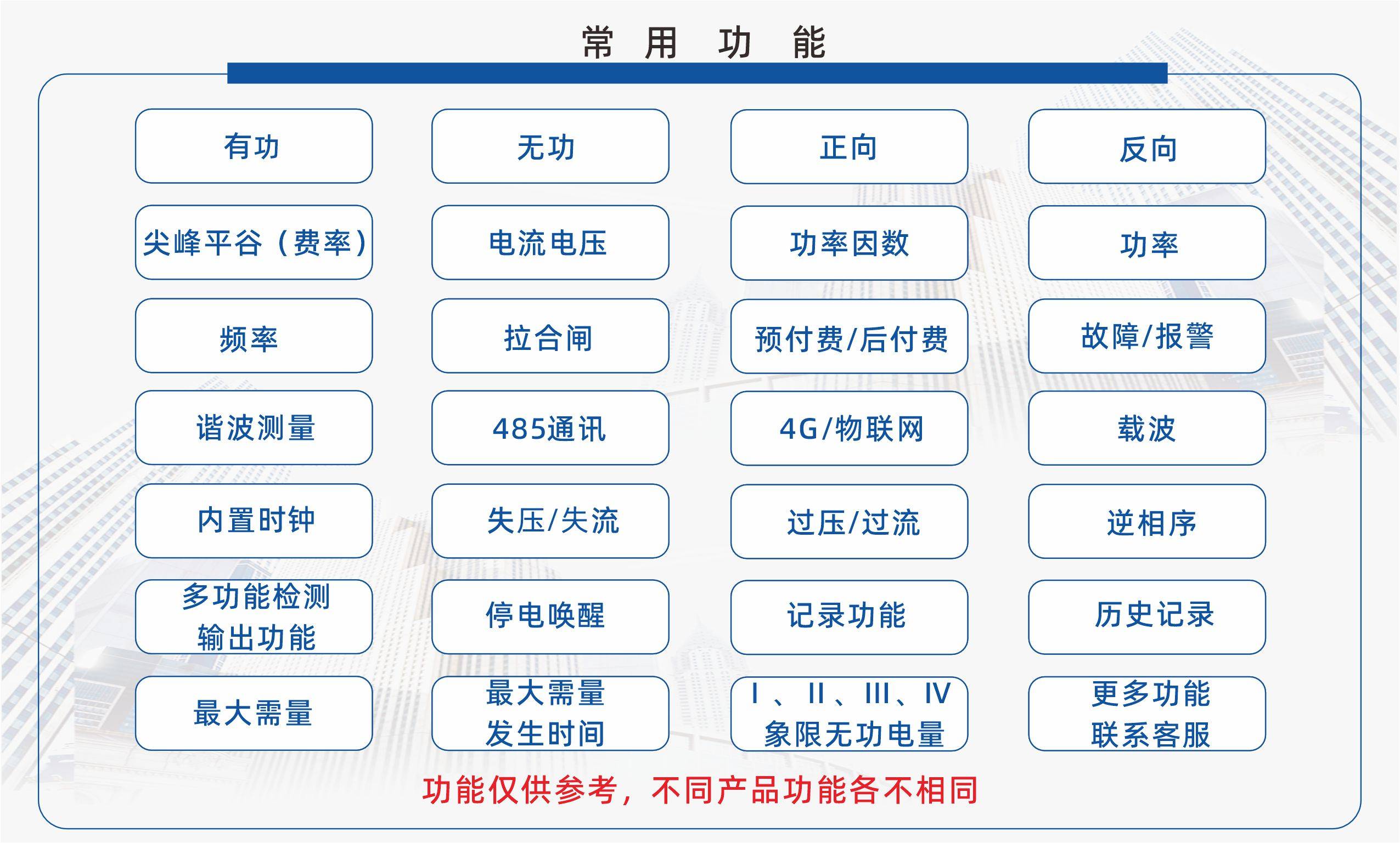 多功能电力仪表,一种具有可编程测量、显示、RS485数字通讯和电能脉冲输出的多功能智能电力仪表,能够完成三相电参量测量(三相电压、三相电流、有功功率、无功功率、视在功率、功率因数、频率等)、谐波测量、电网质量分析(电压波峰系数,电流K系数,电话波形因子,电压电流不平衡度,电压电流序量等)、四象限电能计量、复费率电能计量、最大需量记录、SOE事件记录、数据显示、采集及传输,可广泛应用变电站自动化、配电自动化、智能建筑、企业内部的电能测量、管理、考核。测量精度0.5级,实现LCD现场显示和远程RS-485数字接口通讯,采用标准DL/T 645-2007或MODBUS-RTU通讯协议。